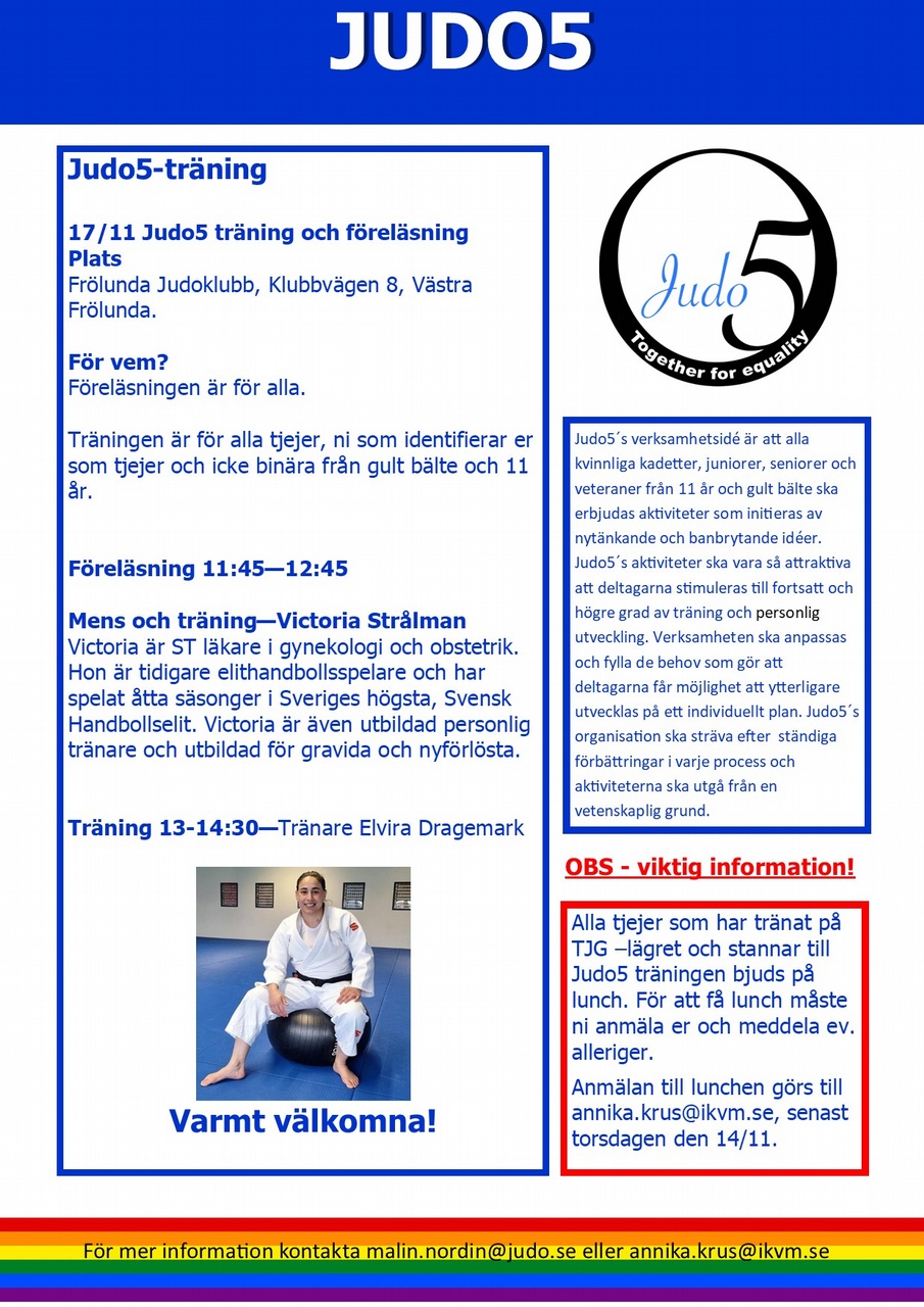 På söndag är det Judo5 träning på Frölunda JK för tjejer och icke binära från gult bälte och 11 år kl 13-14.30 med Elvira.